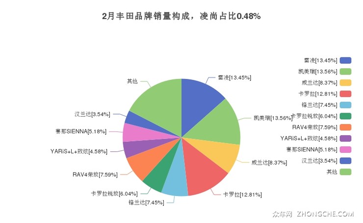 2023年2月,丰田品牌总体销量达到85338辆,其中凌尚销量达到409辆,占品牌总销量的0.48%。
