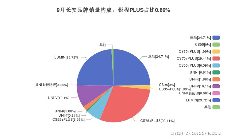 2024年9月,长安品牌总体销量达到51783辆,其中锐程PLUS销量达到446辆,占品牌总销量的0.86%。
